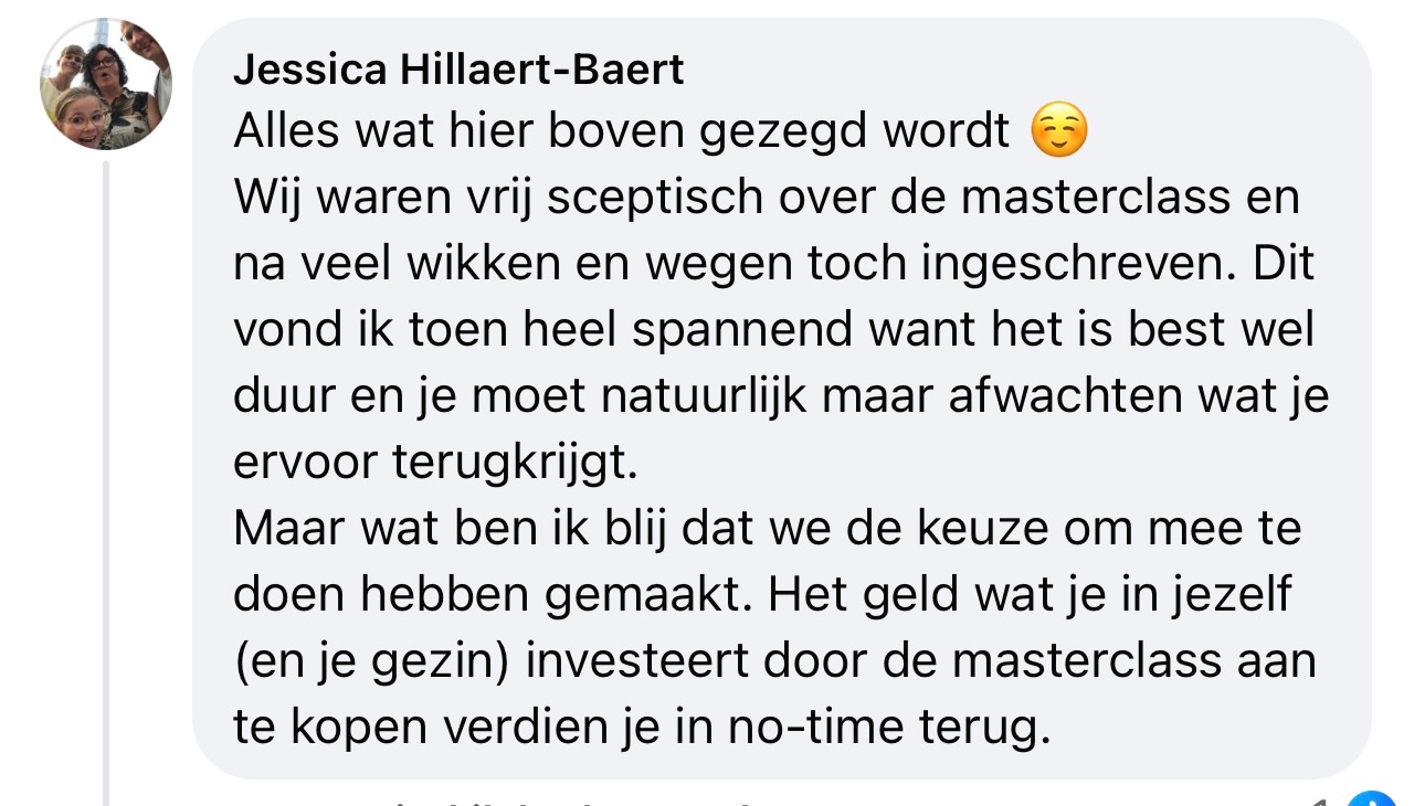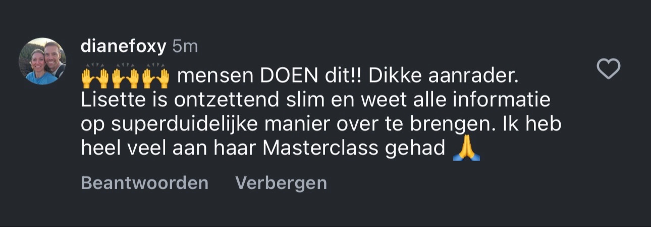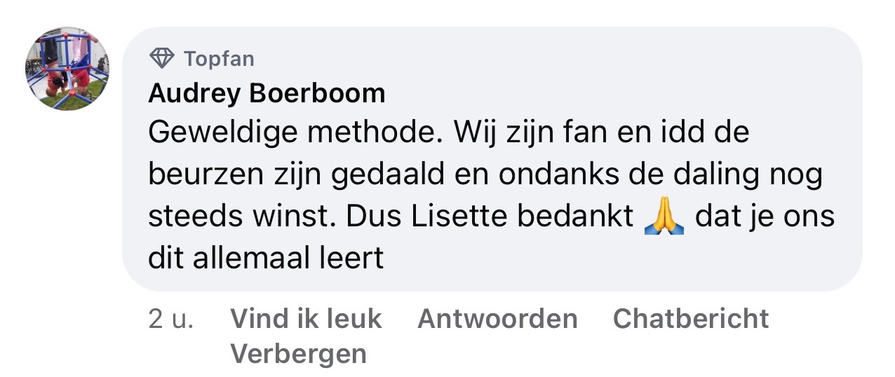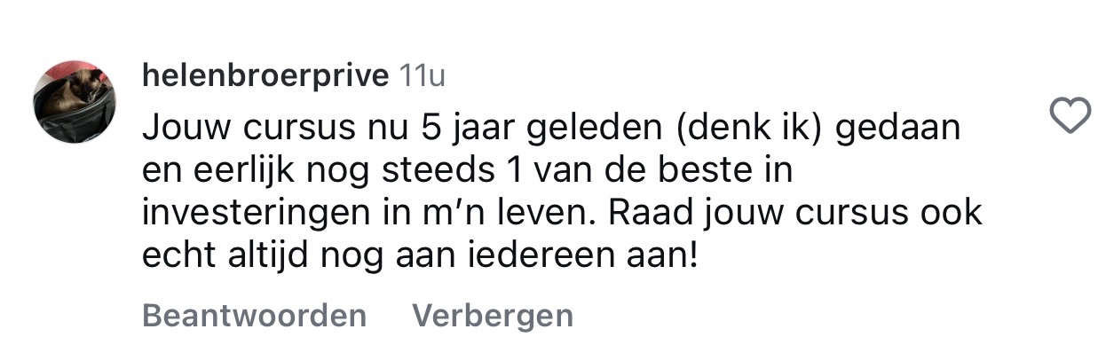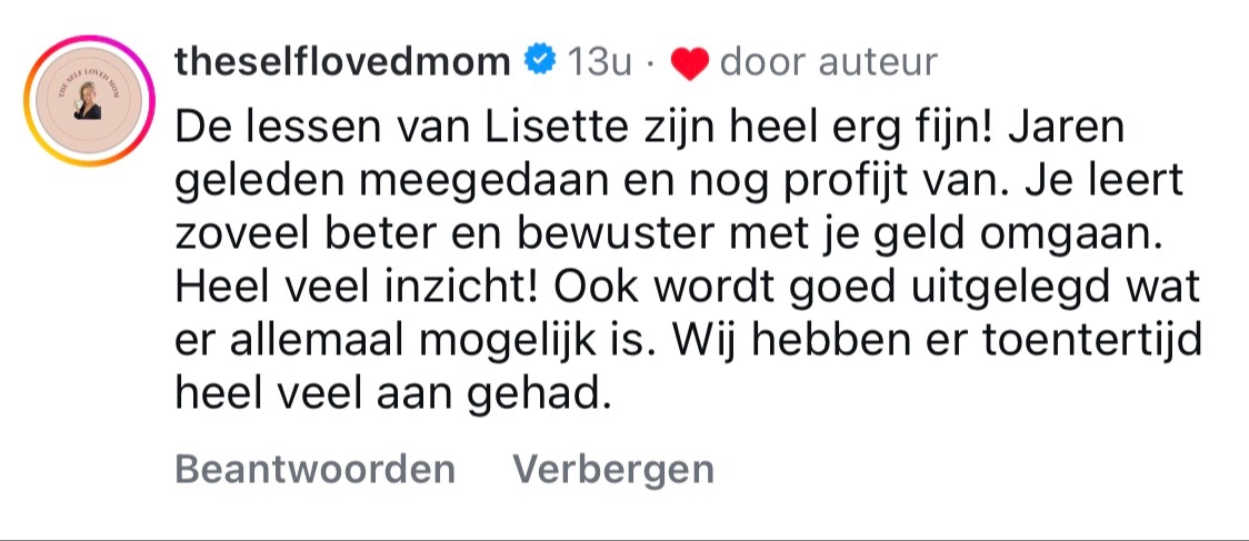 Lisette helpt je om je uitgaven in één keer helder te krijgen én laat zien hoe je daarna je vermogen laat groeien. Haar 5-stappen roadmap is heel concreet en stap-voor-stap, met video’s, live sessies en een community. Dit is kennis waar ik de rest van mijn leven profijt van heb.